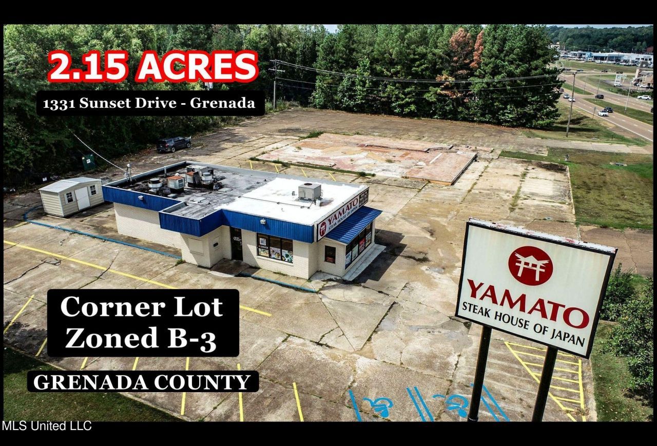 Located on the heavily trafficked Sunset Drive in Grenada, this large commercial corner lot is over two acres and is just one mile east of I-55. The property is zoned B-3, Heavy Commercial, allowing endless business opportunities. With over 300 feet of frontage on Sunset Drive and nearly as much on Jefferson Trail, there's plenty of room for multiple businesses. It's home to a freestanding 1728 square foot building that's currently leased to Yamato Steak House of Japan. The existing building is currently leased for $2,500 monthly with the tenant paying all expenses. The lease is for the building only and excludes the parking area.The lot has over an acre of concrete with three separate entrances and a daily traffic count of 23,000. A row of trees spans the back of the property, providing a solid buffer from the adjoining neighbor. An older brick building was previously on the property, but it's been completely removed, and the site is ready and waiting for new commercial construction. High traffic corner property & prime location!